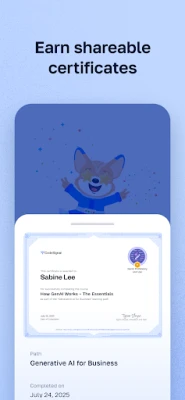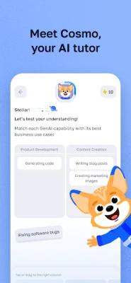 Miks just Cosmo? Sinu tehisintellektist juhendaja Cosmo isikupärastab õpiteekonna, aidates sul kiiremini omandada uusi teadmisi ja oskusi. Praktilistel ülesannetel põhinevate õppetundidega on uute oskuste omandamine nauditav ja efektiivne, võttes vaid mõne minuti päevas. Ehita üles ja kinnista karjääri seisukohalt kõige nõutumaid oskusi, mis viivad sind edasi. Kõik kursused on täiesti tasuta ning saadud teadmiste kinnituseks võid teenida jagatavaid sertifikaate ja oskusmärke. Vali valmiskursuste vahel või lase Cosmosedel aidata sul mis tahes teemat koheselt praktiseerida.