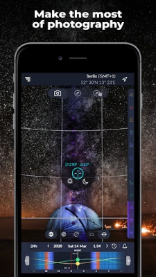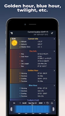 See rakendus aitab fotograafidel planeerida ja ennustada Päikese, Kuu ja Linnutee asendit. Saate visualiseerida päikesetõusu, -loojangu, kuldse ja sinise tunni ning hämariku aegu. Leidke parimad hetked vapustavate ja täiuslike fotode tegemiseks.