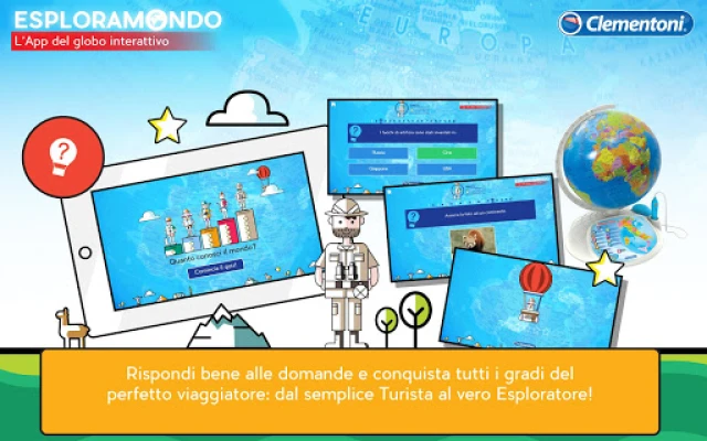 Testige oma teadmisi lõbusas Viktoriini mängus. Vastake küsimustele õigesti ja teenige tiitleid, liikudes lihtsast "Turistist" kogenud "Esploraatoriks", tõestades oma maailma tundmist. See rakendus pakub terviklikku ja harivat teekonda, mis inspireerib nii noori kui ka vanu rändureid avastama, õppima ja mõistma meie planeedi mitmekesisust. Kogege enneolematut gloobuse avastamise rõõmu ja muutke iga õppimishetk seikluseks Clementoni abil.