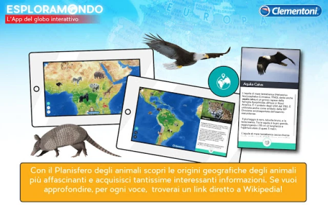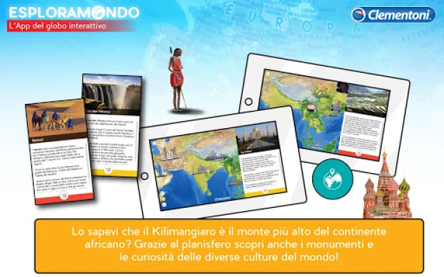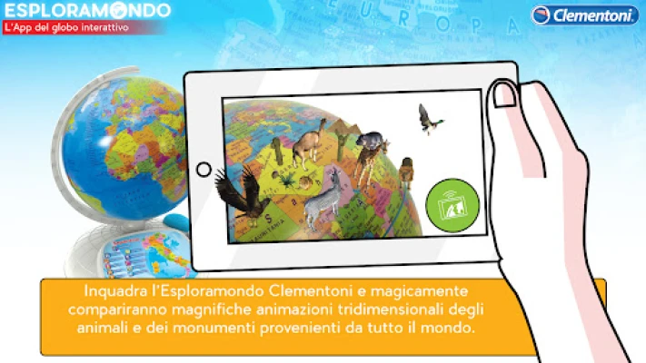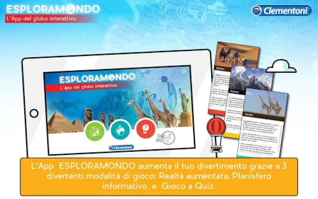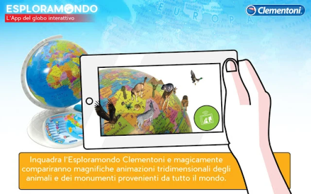 Esploramondo App toob Clementoni Esploramondo gloobuse ellu! See rakendus on mõeldud nii lastele (7+) kui ka täiskasvanutele, pakkudes liitreaalsust, planisfeeri ja viktoriini. Avasta maailma loomade ja monumentide 3D-animatsioonide kaudu, õpi uusi fakte ning testi oma teadmisi, et saada tõeliseks maadeavastajaks. Suurenda mängu ja õppimise rõõmu.