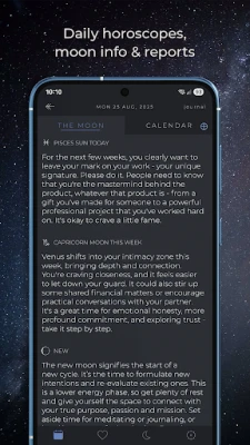Kujuta ette elu, mis on harmoonias universumi vanima rütmiga. See rakendus pakub ainulaadset võimalust sukelduda Kuu tsüklite müstilisse maailma, pakkudes isikupärastatud juhendust igaks päevaks. Tasuta versioon avab uksed personaalsele Kuu kalendrile, mis on täpselt kohandatud sinu ajavööndile, asukohale ja sünnikaardile. Saa osa igapäevasest horoskoobist ja praktilistest näpunäidetest, mis aitavad sul oma elu Kuu faasidega sünkroniseerida. Olgu selleks siis Päikese või tõusev märk, Kuu märk, faas, valgustus või varjutused – kogu vajalik igapäevane Kuu info on sinu käeulatuses. Avasta Kuuga kooskõlas olevad rituaalid ja enesehooldussoovitused ning jälgi oma sünnikaardile tuginevaid Kuu transiite – sinu isiklikku Kuu tsüklit. Integreeri olulised sündmused oma kalendrist ja naudi mugavat vidinat, mis kuvab Kuu infot ja üldist päevahoroskoopi otse sinu avakuval.
